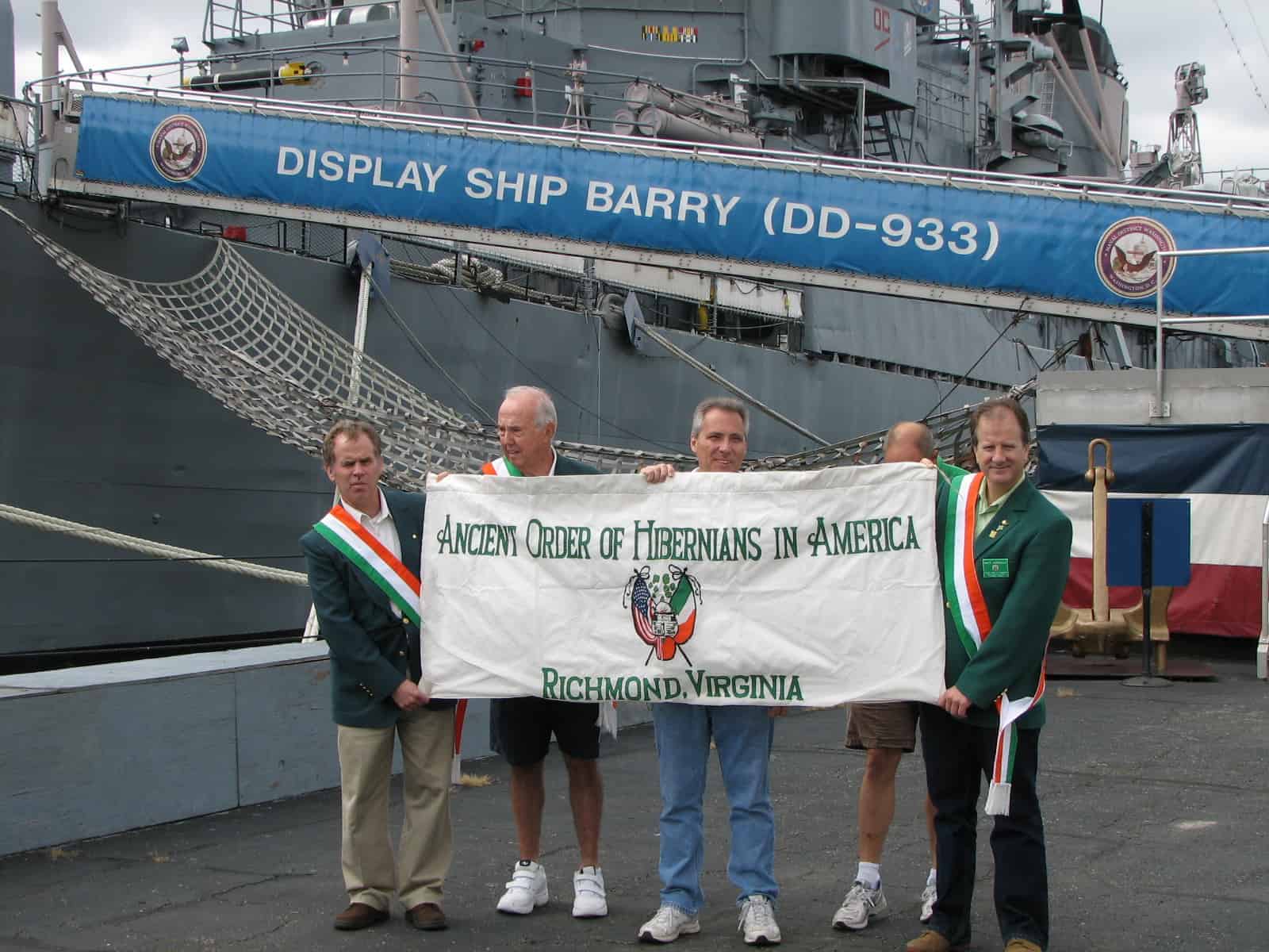 On September 12, six members of the Dooley Division travelled to Washington Navy Yard to visit the Display Ship Barry to honor the father of the US Navy, John Barry. John Barry was born in County Wexford and a practicing Catholic. While having our picture taken on the pier, several people recognized our AOH sashes and struck up a conversation about the AOH. In addition to remembering CMD Barry, the Dooley Division visited the Naval Museum on base: also a great experience. The Division stopped at Molly Malone’s Pub about 1/2 mile away and across from the Marine Corps barracks.